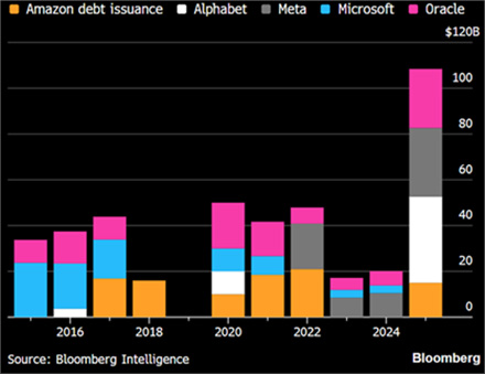 Investors still had plenty information to digest, though, with big tech’s spending spree blowing previous CAPEX plans out of the water. Investors grew concerned that an increasing portion of this CAPEX spend is being financed by debt, rather than free cash flow. The five major big spenders on AI — Amazon, Alphabet, Microsoft, Meta and Oracle – have raised a record $108 billion in combined debt in 2025, more than three times the average over the previous nine years, according to data compiled by Bloomberg Intelligence.